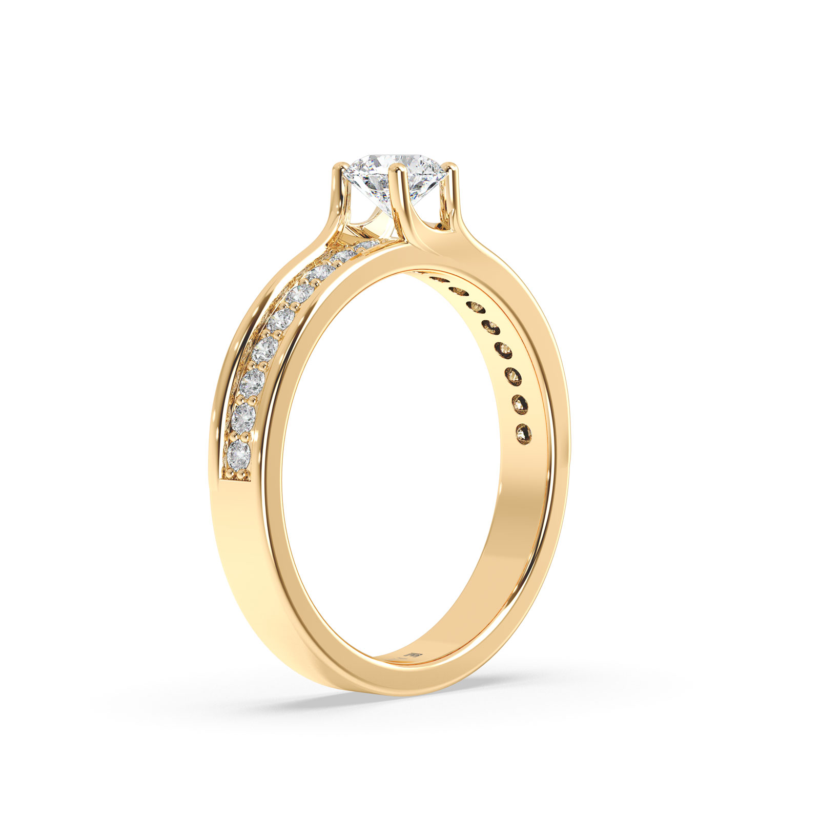 El anillo de compromiso con piedras laterales Daysi ofrece un equilibrio perfecto entre elegancia clásica y detalle moderno. Su piedra central redonda está elevada en un engaste visible, acompañada a cada lado por zirconias pequeñas que realzan el brillo total de la pieza sin restarle protagonismo al centro.
